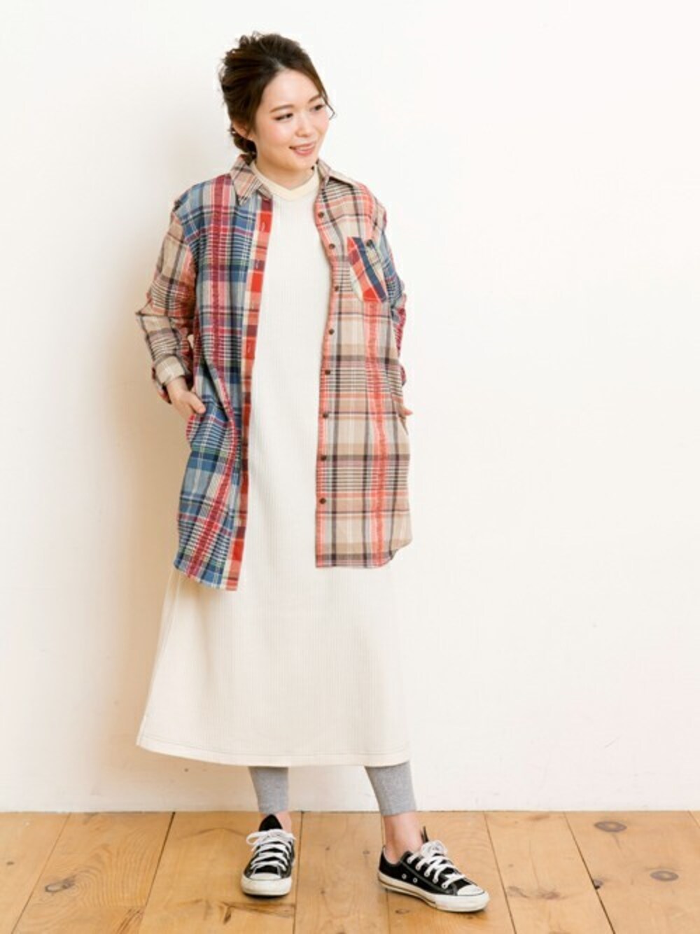 ワッフルワンピに、爽やかなマドラスチェックシャツを合わせたカジュアルコーデです。 シャツは暑くなったら、腰に巻いてもコーデのポイントになるのでこの時期オススメの羽織りです^^