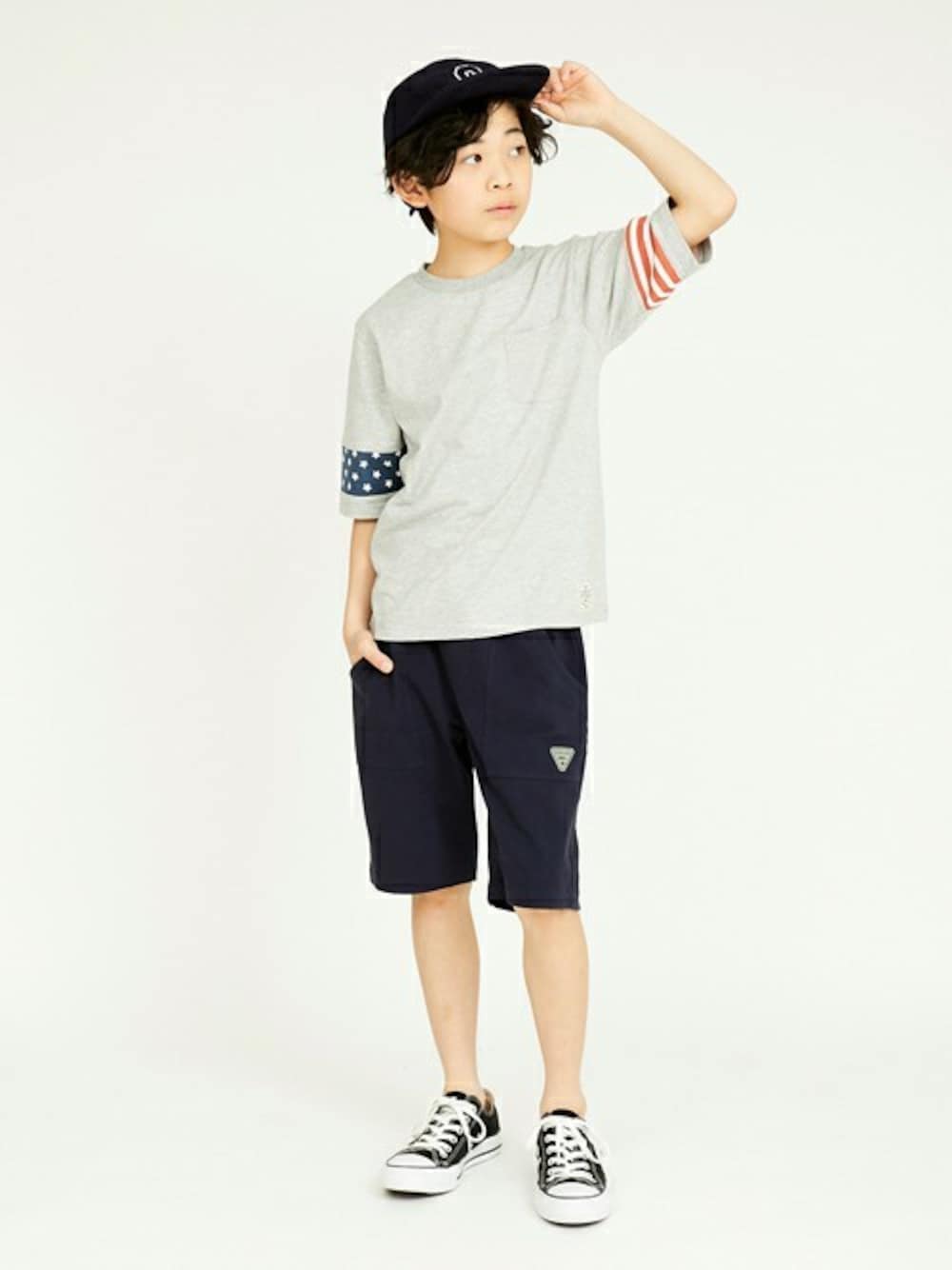 半袖だとまだ早いようなこの時期には、5分袖Tシャツはいかがですか? シンプルながら、袖のアメリカ国旗の柄がコーデのアクセントに◎ 高学年のお兄ちゃんにもオススメアイテムです!