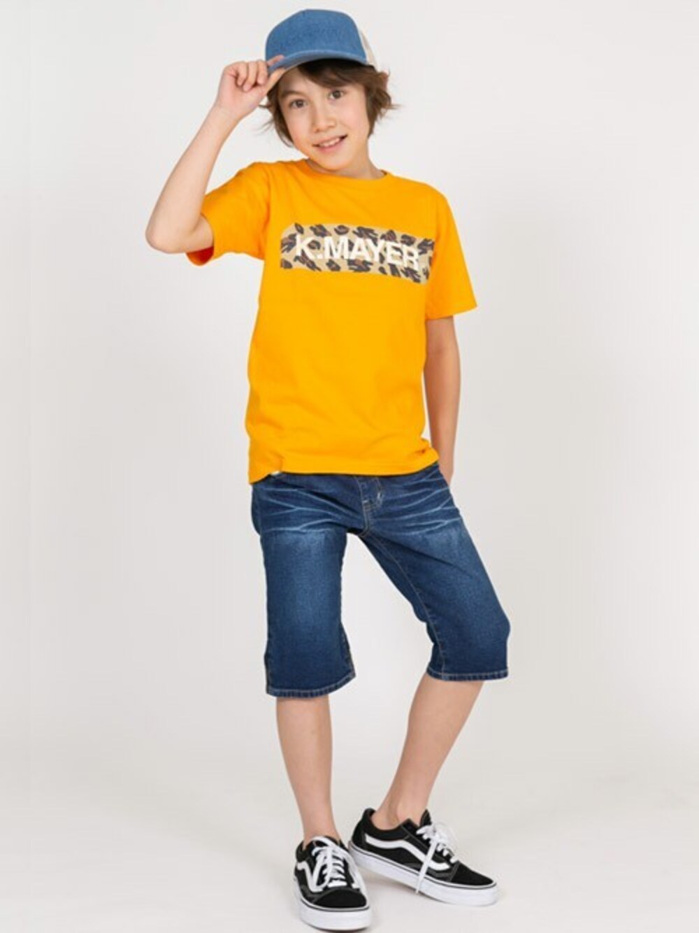 ビビットなTシャツをデニムハーパンにON! ロゴの背景はヒョウ柄で、元気な夏らしいコーデが完成♪