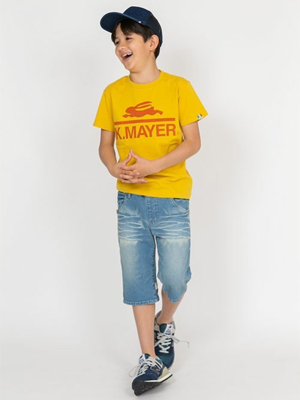 USEDの加工感があるデニムに元気な夏色TシャツをON! 元気に遊ぶ子供にぴったりなコーデ♪