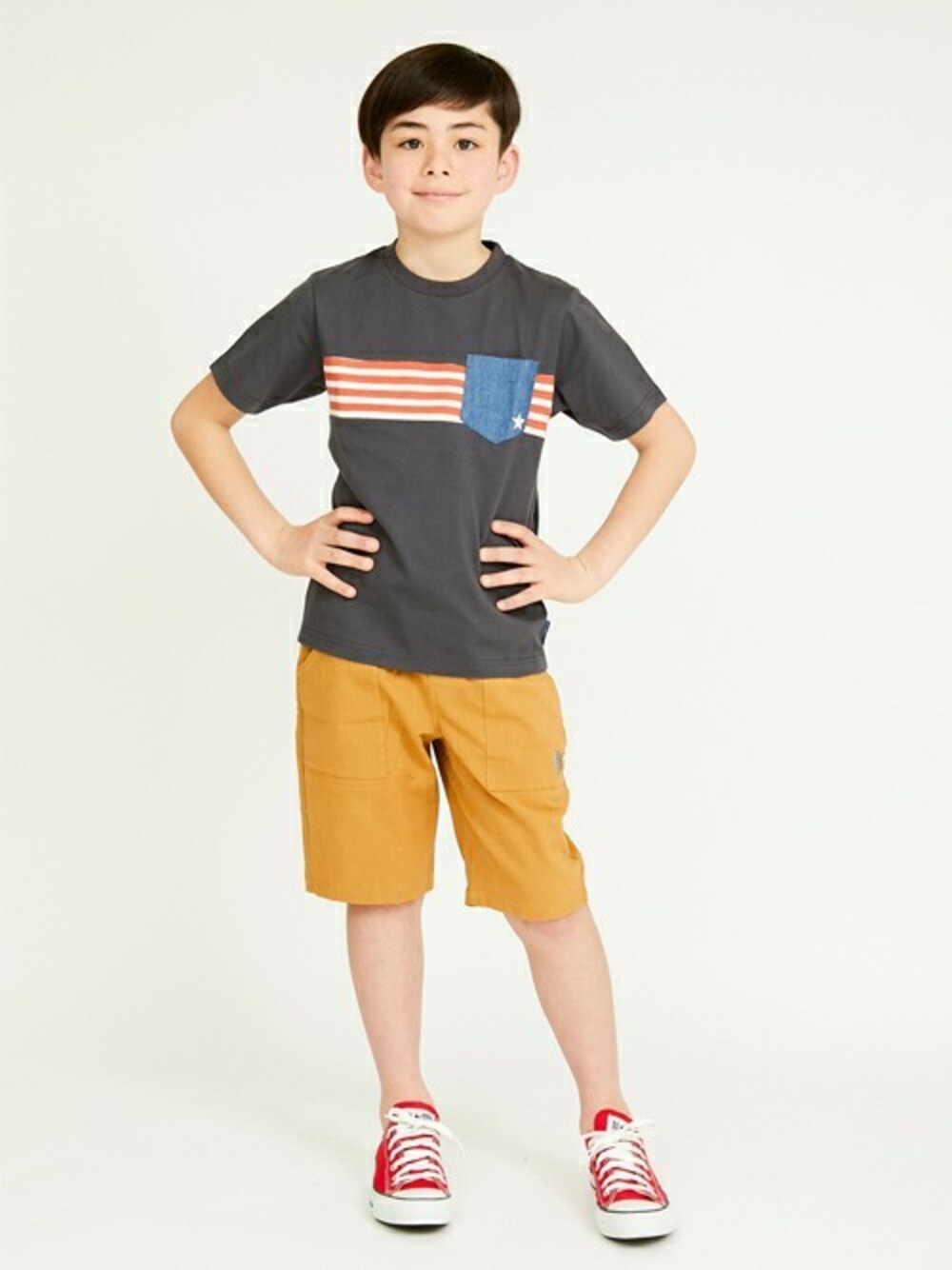 アメリカ国旗チックなデザインTシャツ! シンプルなデザインでも個性的に◎ ボトムは麻のような風合いのパンツなので、夏でもさっぱりはけちゃいます♪