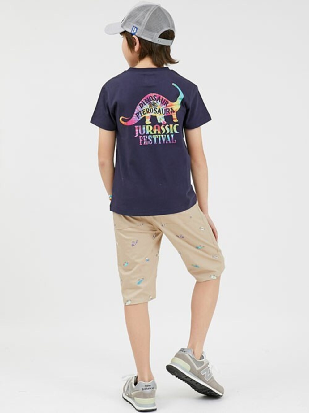 背中で語るバックプリントシリーズ! フェス感あふれるカラフルタイダイ風の恐竜プリント! パンツも刺繍総柄で、おしゃれ感満載♪