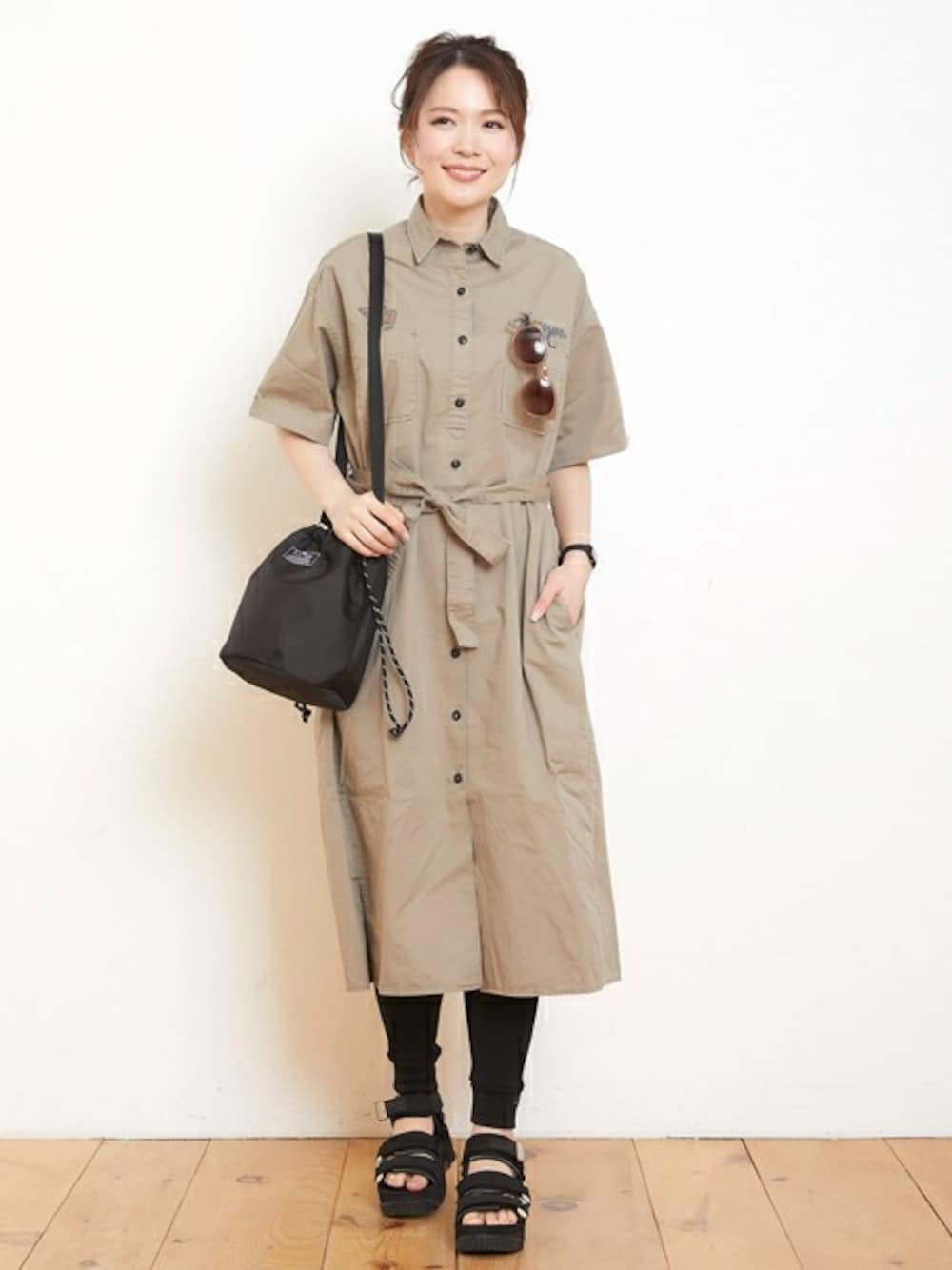 1枚でコーデが完成するワンピース♪ ラクチンでオシャレに見えるので、オススメのアイテムです。 ワークテイストのシャツワンピは、甘くなりすぎないのがGOOD! 小物を黒で統一して、大人カジュアルなコーデにしてみました♪