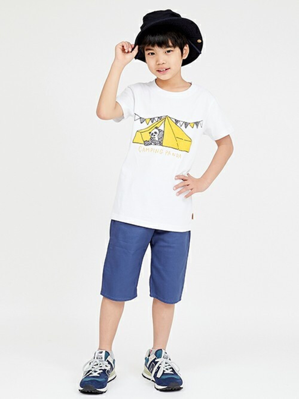 テントから顔を出したパンダがキュートな半袖Tシャツと、 撥水加工を施したハーフパンツを合わせました♪ キャンプに遊びにぴったりのゆるかわコーデです!