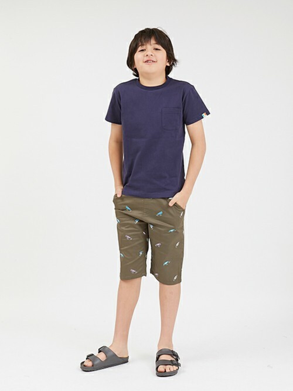 フィッシングで使う様々なルアーを刺繍で施した、ハーフパンツとフロントがシンプルなバックプリントTを合わせました! パンツはハリ感があり、プラス伸縮性も備えた生地に活発に動く子供たちに最適な素材感と、夏の雰囲気にぴったりの総柄デザイン♪ アウトドアテイストのコーディネートにもよく合う1枚です!
