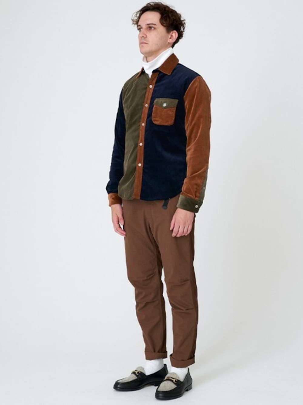 KRIFF MAYERらしいクレイジー配色で切替えた、秋冬にピッタリな季節感溢れるコーデュロイシャツです。 タフでしっかりとした生地感なので、シャツジャケット感覚でガンガン着まわせます。 伸縮性に優れたコーデュロイ生地を使用。 のびのびなストレッチで動きやすくなっています。 左胸のコンチョボタンを配したマチ付きポケットがアクセントに。 トップス使いはもちろん、差し色使いとしてベストなどアウターとのレイヤードコーデにもオススメですよ!