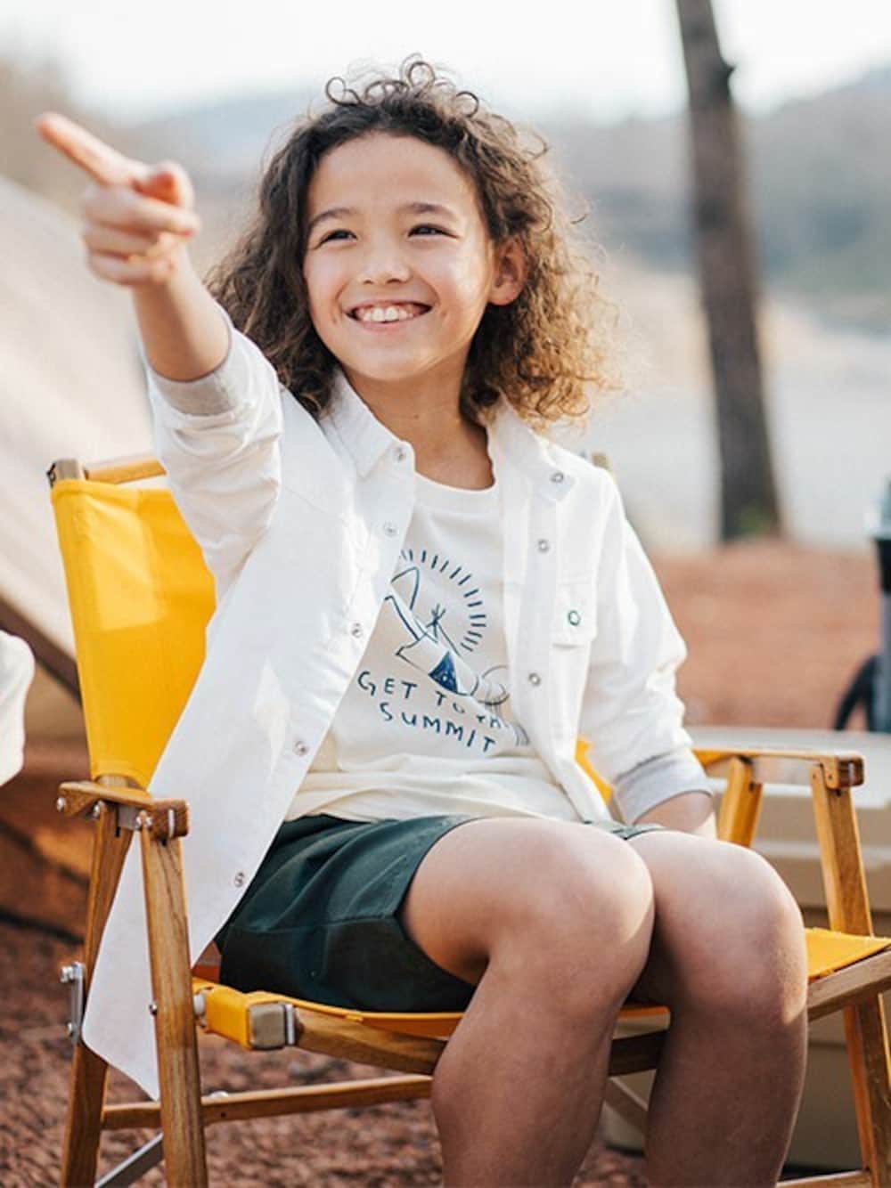 袖まくりしやすい、リブの袖口シャツはアウトドアシーンの羽織りとしても◎ 自然の中で、白ベースのトップスに、カーキグリーンのボトムスが好相性なコーデです♪