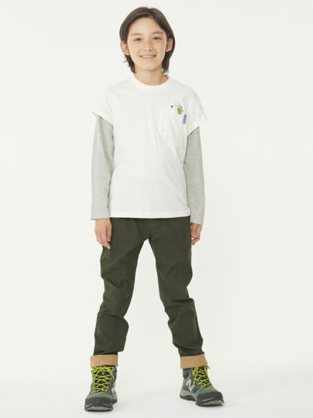 サーマル生地のフェイクレイヤードTシャツコーデ♪ 1枚着るだけででレイヤードスタイルが完成! ハリのある生地感できれい見えするパンツを合わせました◎ トップスはバックに縦ロゴ、ボトムスは裾を折り返すとロゴがチラ見え! 後ろ姿もバッチリ決まるコーデです^^