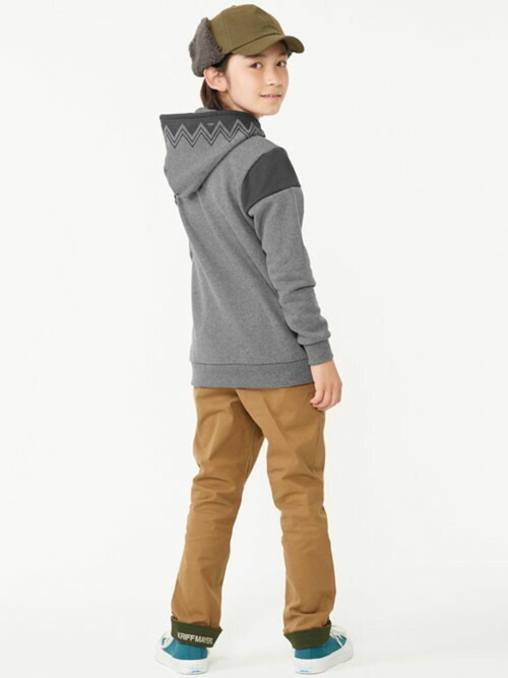 フード部分に山×ネイティブなデザインをプラス! 派手過ぎないデザインがお洒落でかっこいい一枚です。 大人っぽく着こなせるのでお兄さん世代にオススメ♪ 肩切替の配色もこだわりポイント! パンツはセンタープリーツとポケットの膨らみがちょうどいいバランスで 子供らしさと大人っぽさを両方感じさせる一枚です。 裾を折ると左後ろにブランドロゴが!! 遊び心のあるデザインで成長期にも楽しめます。