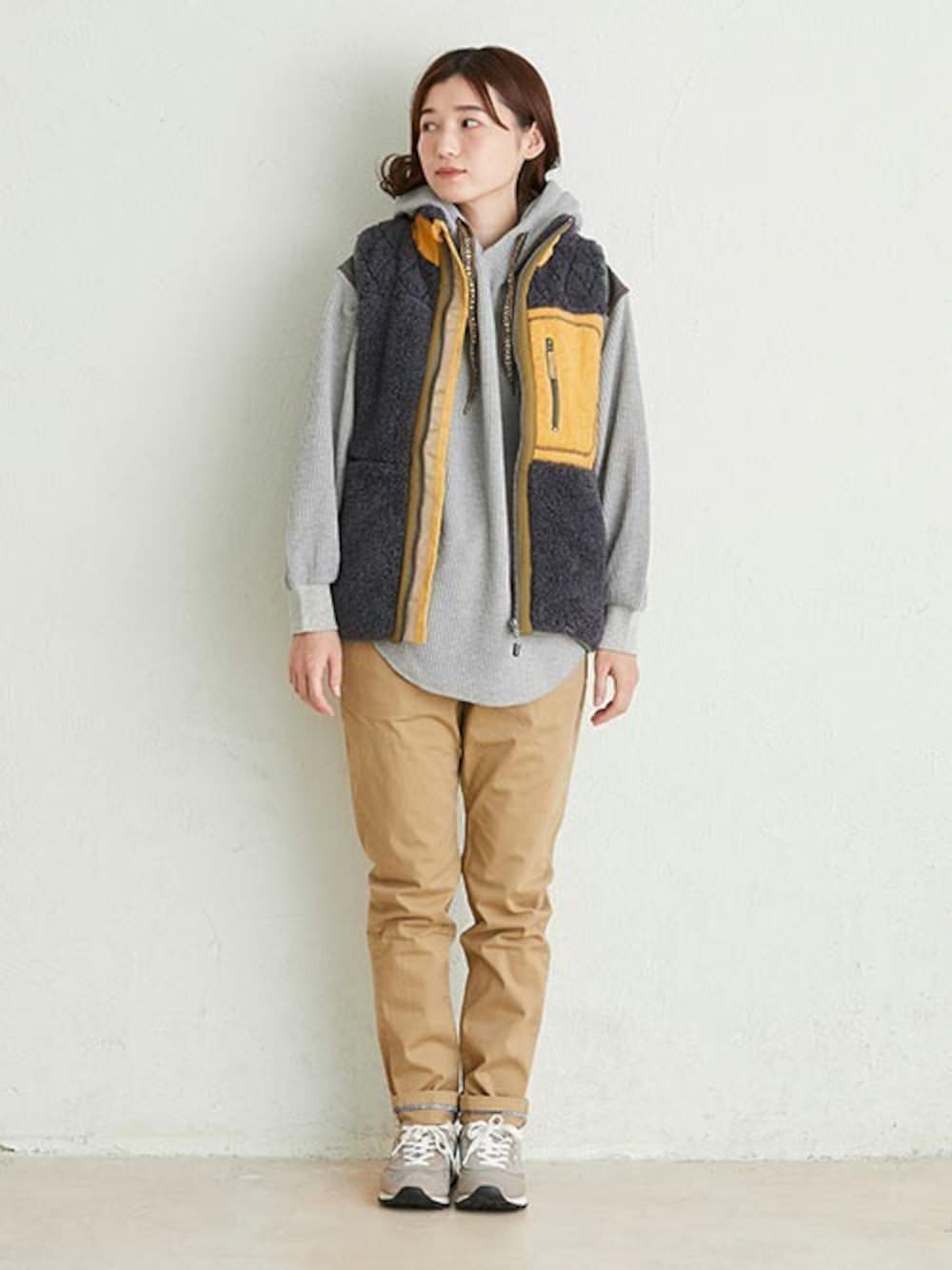 ふわふわのボアを使用したアウトドアライクなベスト。 今季は各所にコーデュロイを使用し季節感あふれるほっこりアイテムに仕上がっています。