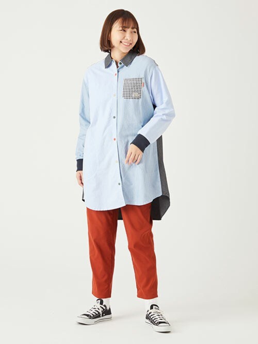カラフルなスナップボタンと切替が特徴的なシャツチュニックです! 無地のオフホワイト、ギンガムチェックやストライプ柄などを切替えたマルチカラーデザインが、 ハッピーな気持ちにさせてくれるポップでアクティブな仕上がりです♪