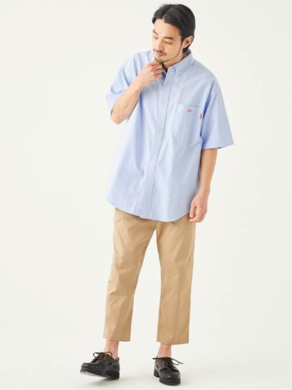 T/Cオックスフォード素材を使用したボタンダウン半袖シャツです。 ゆったりとしたリラックスフィット。 左胸ポケットに配したワンポイントロゴ刺繍がアクセントに。 サイドポケットが付いているので、ショーツに合わせたキャンプスタイルでのアウター使いにもオススメです。