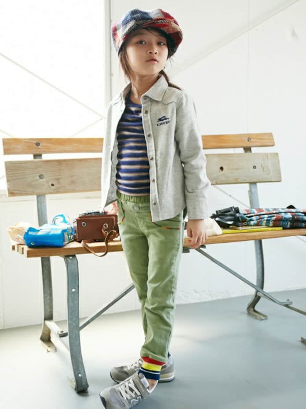 元気KIDSに最適な裾リブストレッチパンツに可愛いくて柔らかなボーダーインナーを合わせ、ふわふわの柔らかシャツをON!