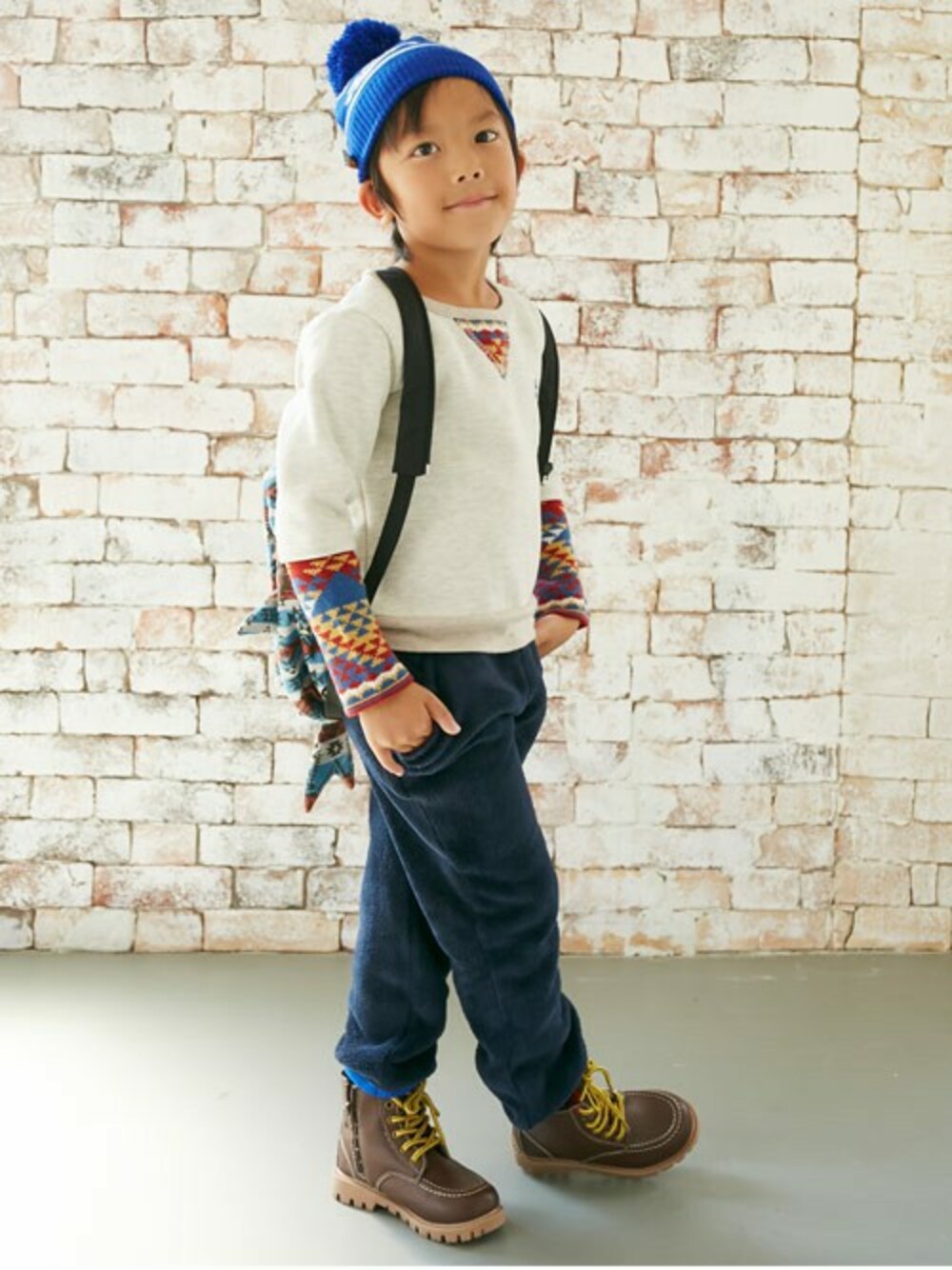 POPで明るい袖のニット切替と、ガゼット部分のニット切替が呼応して、子供らしい可愛らしさを引き立てます。ボトムスは楽ちんで、暖かなフリースパンツ♪