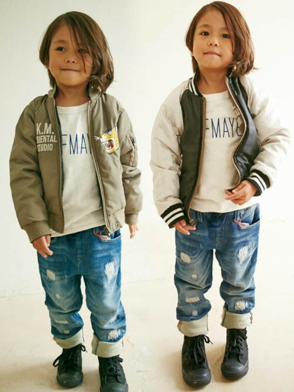 スカジャン×スタジャンのリバーシブルJKT 1枚で、違う雰囲気の、我が子の可愛らしさを、思う存分楽しめちゃうという・・・・素晴らしい♪ スカジャン側は、旬のMA-1型になっていて、かっこいいし、刺繍は子供らしく可愛らしい、しかも前面だけでなくバックプリントも圧巻の総刺繍です~♪♪ バックの刺繍の豪華さときたら・・・よく作ったね、西川さん(←KIDSデザイナーです) パンツは、柔らかくて動きやすく、ストレスフリーな素材なのに、加工感が本格派のデニムという(^^ 子供らしさと、背伸びした子供の可愛らしさの狭間ってところですかね~