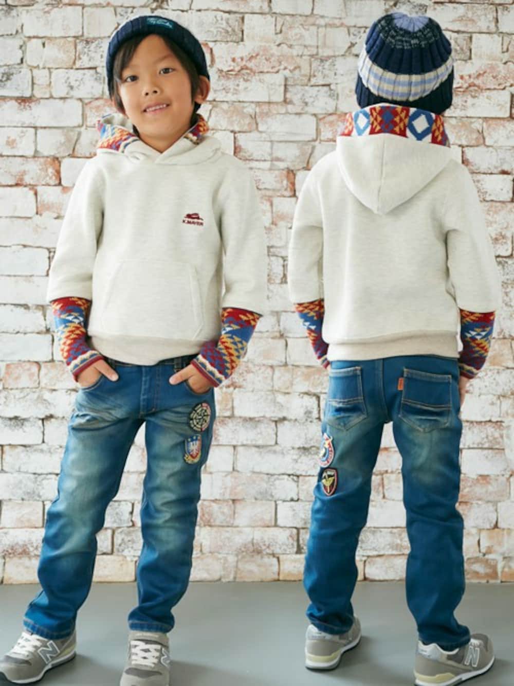 朝晩、寒くなってきましたね~ 子供のときにしかできないかわいいコーデ。でも男の子ってそれを嫌がることも・・・ という事で、カッコよくて、かわいいポイントを絶妙に混ぜ込む。ここがポイントです ! 袖とフード口の部分がニット切替えになっていてかわいい。だけど基本シンプルなのでかわいすぎない。 プラス、加工をきかせたデニムを穿いて、ちょっと背伸びしたかっこいい感じを演出。 この上下、どちらも裏フリースなので、暖かさも◎