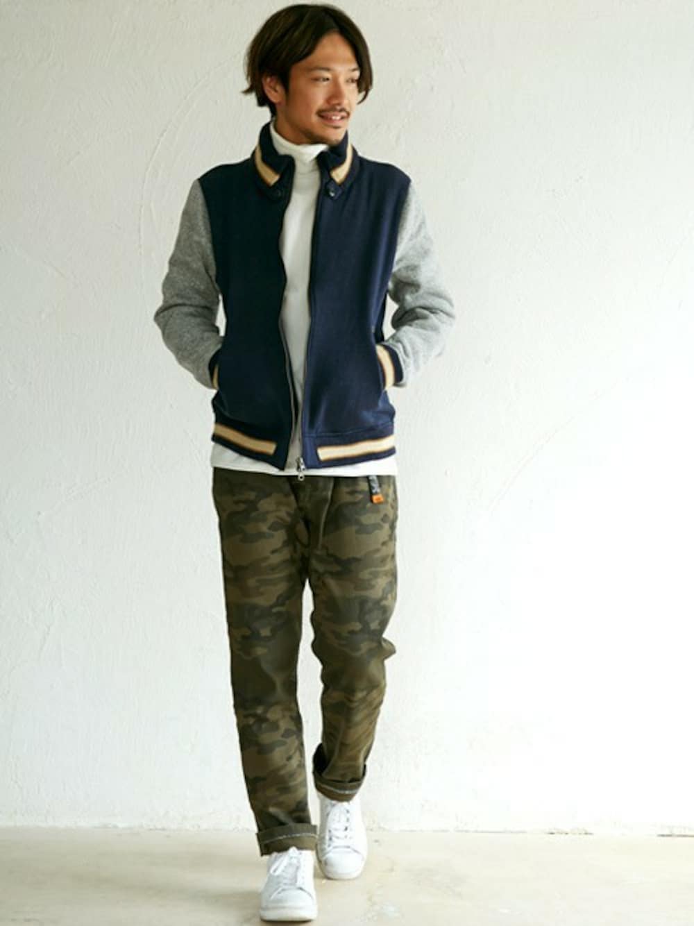 今季コーデで、おさえておきたいポイントは、やはりネック ! ボリュームのあるドンキー襟のジャケットは、少し尖ったスタイルになりがちなのを、ツイードの優しくナチュラルな風合いが包み込んで、絶妙な形に着地させてくれます。 暗くなり過ぎないように、インに白、ボトムは主張し過ぎないカモ柄でまとめてみました !
