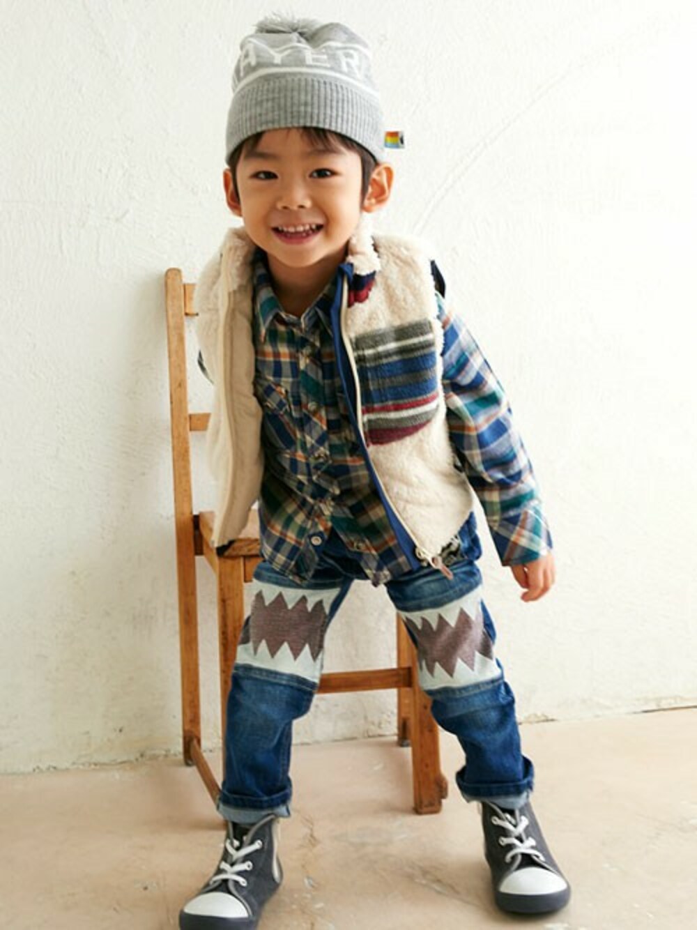 元気そうたくんにピッタリのコーディネート ! 何か面白そうなものを見つけた瞬間の、このちょっといたずらっぽい表情がたまらなく可愛いですね~ ふわもこのシャギーボアも、こうやって着ると、元気でかわいらしい子供独特の演出になるんです♪ 穿いているデニムは、『レッグバイト・ダイナソーパンツ』 このアイテムがあるだけで、元気で楽しい感じになります♪