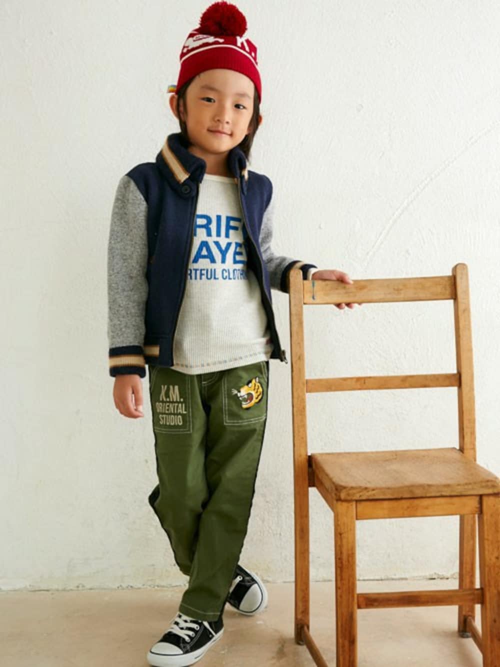 ネックにボリュームをもっていき、インナーは風合いあるサーマルロンT。 それを、刺繍にインパクトのあるボトムスと、レッドニットキャップで挟み込む形で、 存在感のあるコーデにしてみました♪