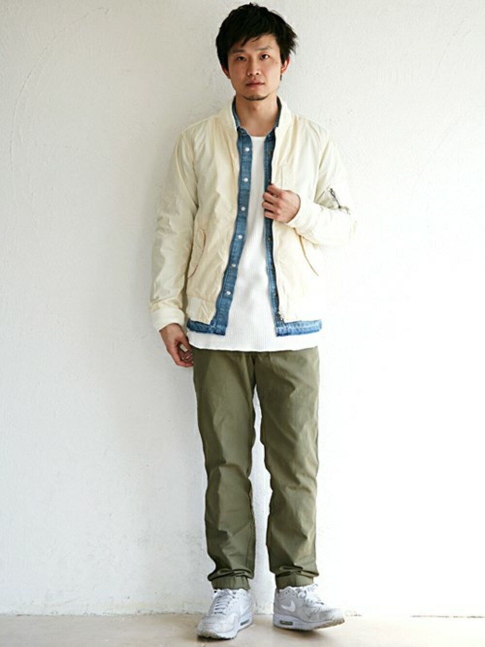 軽くて着やすい春のMA-1を使ったコーディネートです! 今が旬のカラーを至る所に使い、清潔感のあるスタイリングを意識しました。 オススメはとにかく軽くて羽織りやすいMA-1ですね!