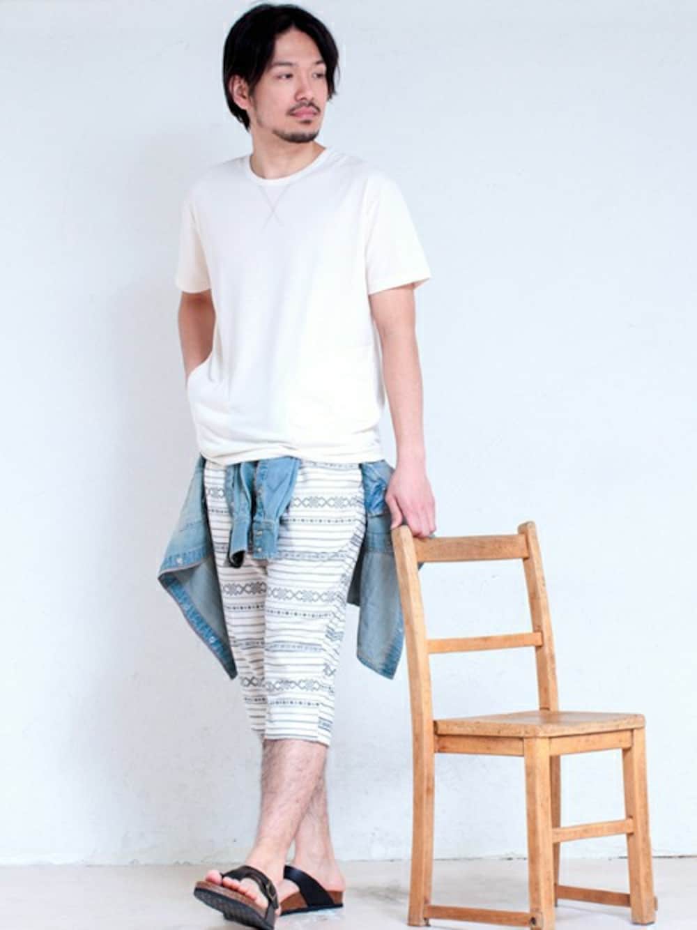 KRIFF MAYERの提案するNEWリラクシングスタイル[ラクチー]! ルームウェアとしてももちろん、ちょっとした外出にも使えるアイテムです♪ コチラはTシャツとクロップドパンツがセットになったタイプです。 アクセントカラーとしてデニムシャツを腰に巻いています!