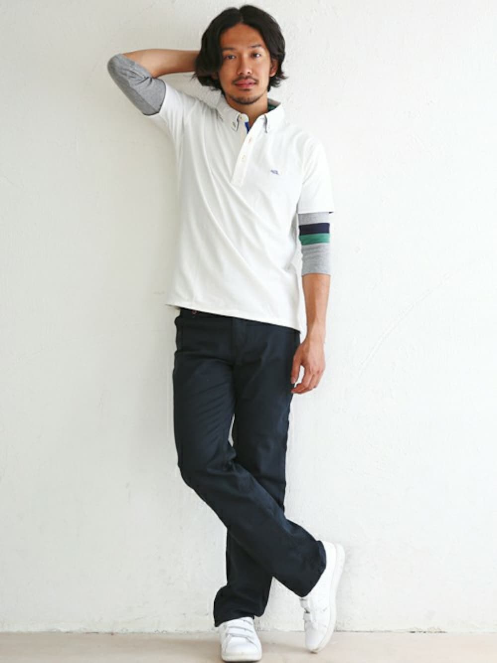 気温が上がってきてはいますが、半袖1枚だと朝&夜はまだ少し寒い… ということで7分袖Tとのレイヤードコーデです! 無地の7分Tではちょっとさみしいので、袖ラインをプラスすると個性的なスタイリングになりますよ!