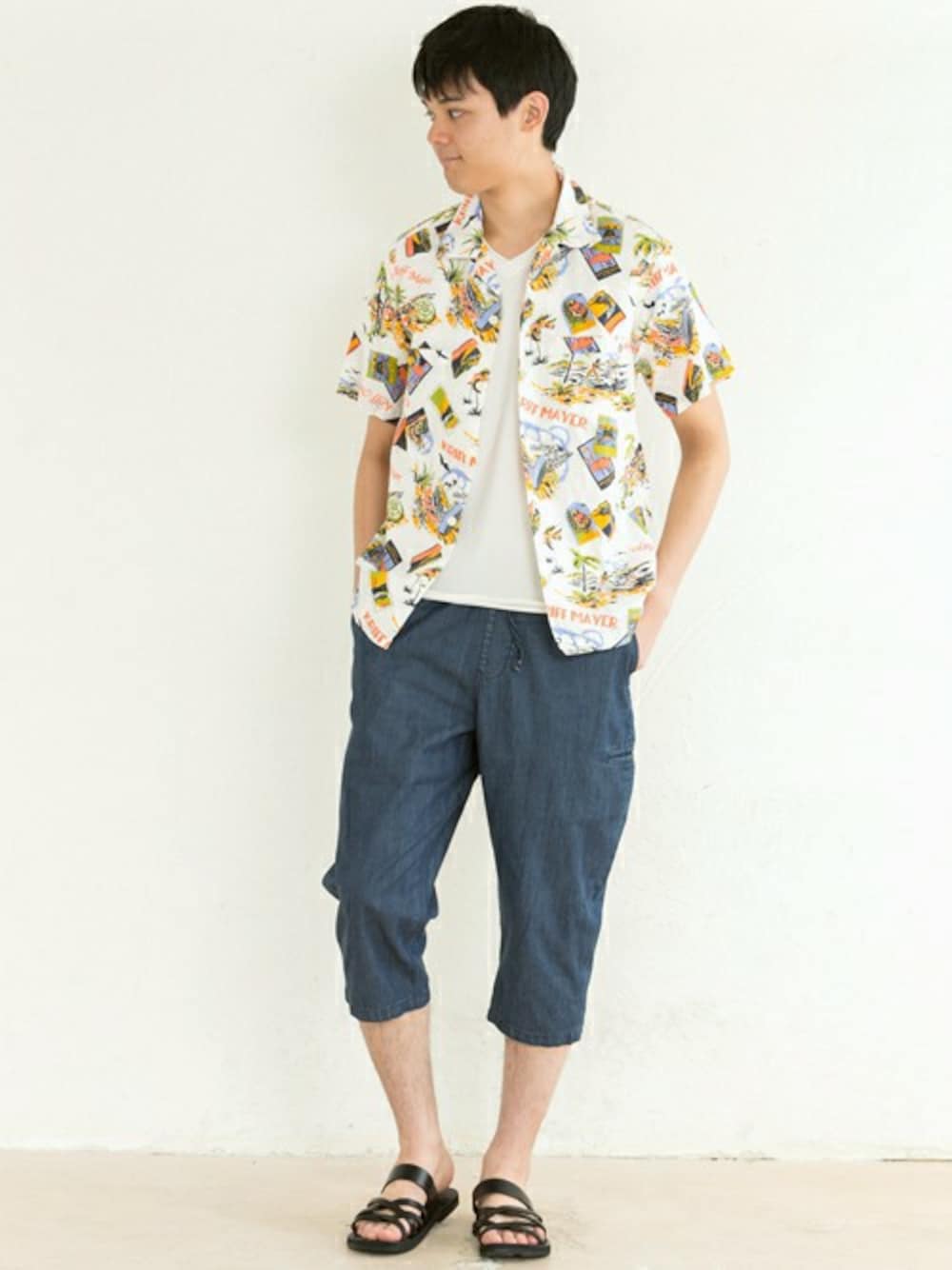西海岸にあるハンバーガーショップをイメージしてデザインされたワークシャツに、ゆったりワイドに穿けるレガースカットパンツと合わせてコーデしました! アロハシャツライクな総柄がポイントです!