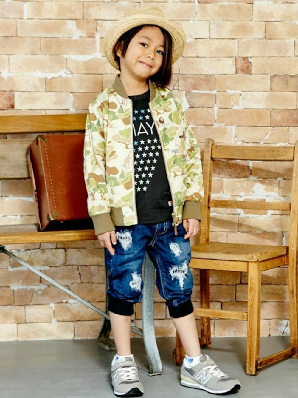 サファリ柄と柔らかなハンターカモ柄をミックスして、オリジナルのカモフラージュに仕上げられたMA-1型ジャケットに、 デニム調の風合いを持つ、柔らかなパンツを合わせています。 リペア加工の施してあるボトムスでアクセントを加え、インナーにアメリカ国旗モチーフのロゴプリントを持ってくることで、 POP感のある、オリジナリティあふれる、ちょっとカッコいいスタイルにまとめてみました! カモフラージュの森に、動物たちがたくさん生息しているので、探してみるのも楽しいかも♪ 春先の、サッと羽織る「シャカシャカジャケット」としても重宝する、 通学服としても、ちょっとおしゃれにキメられる、オリジナルMA-1型アニマル迷彩ジャケット !