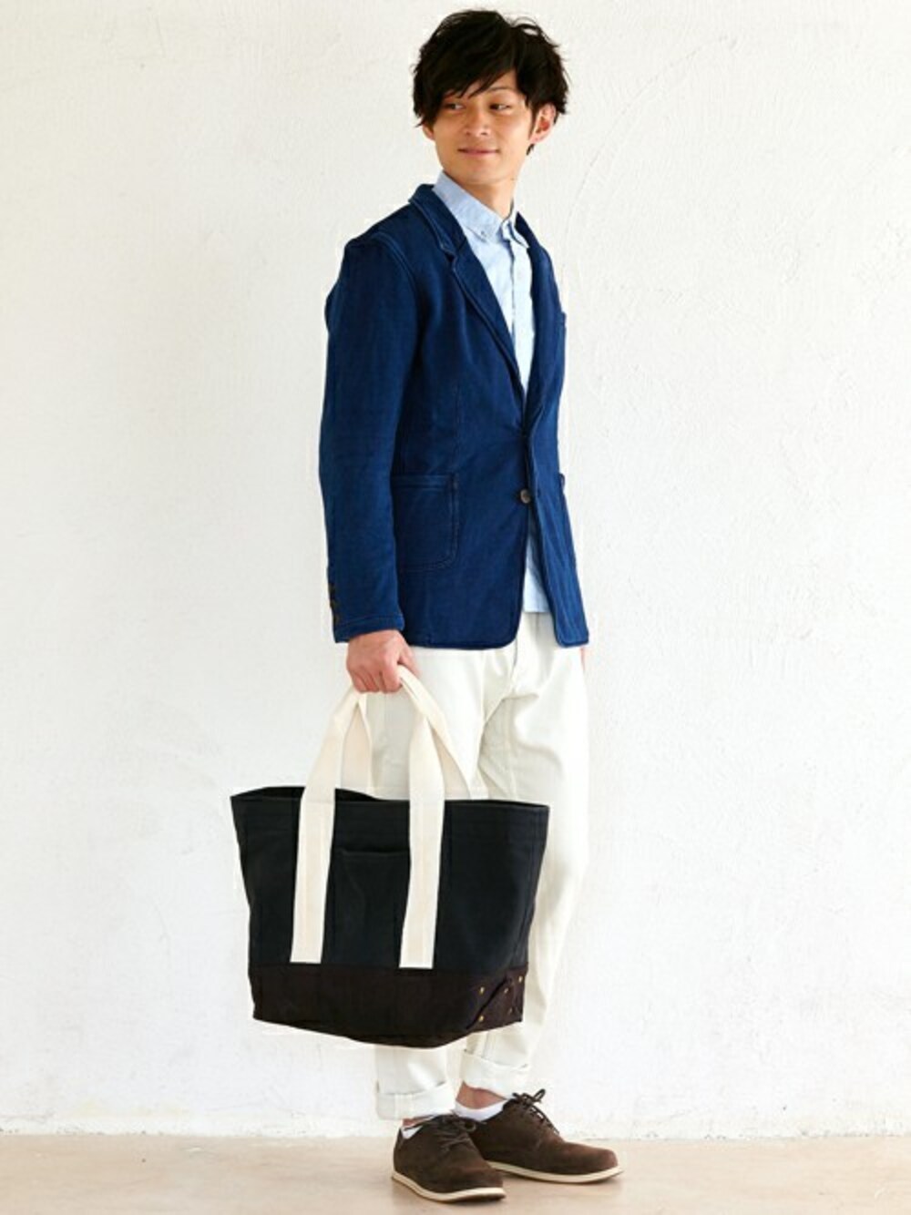 落ち着いた印象の春ジャケットスタイルをオシャレにアップデートする、インディゴの風合いを重ねたテーラードジャケットが一押しポイントです! 清潔感を強調させるオフホワイトのパンツもオススメですよ!