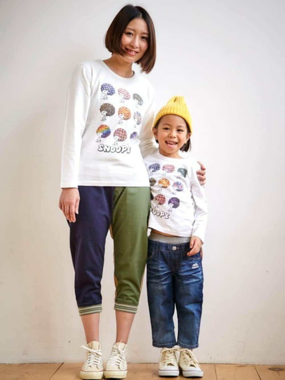 カラフルアフロがかわいいスヌーピー。 ママとおそろもうれしい♪ クロップドパンツ合わせて軽快に、コンバース穿いて出かけよう!
