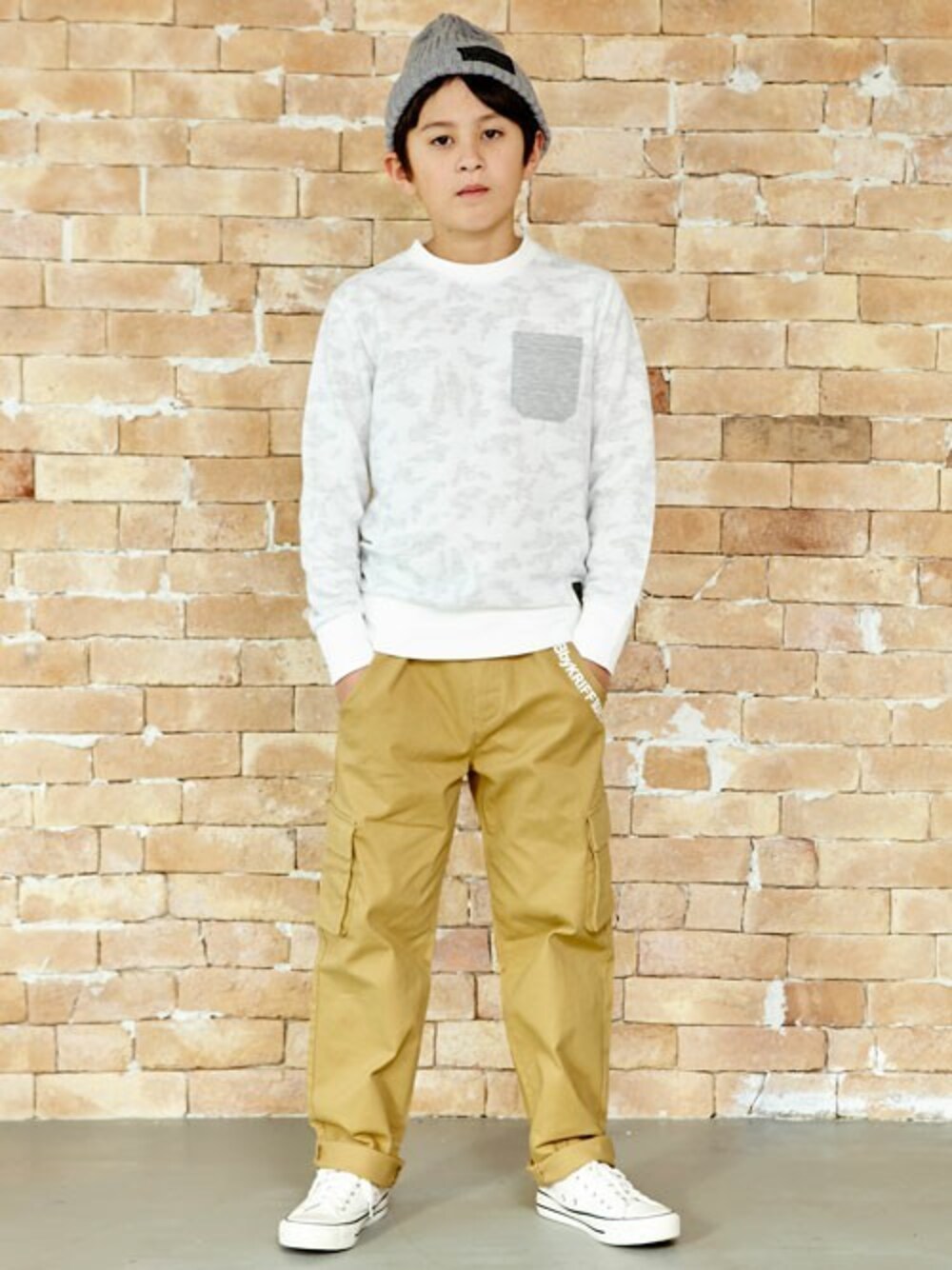 派手すぎないカモフラ柄は、高学年のお兄ちゃんも着やすい♪ ニット帽で、オシャレさプラス☆ 春にピッタリなホワイト&ベージュで優しい雰囲気ながらも、かっこよさのあるコーデにしました!