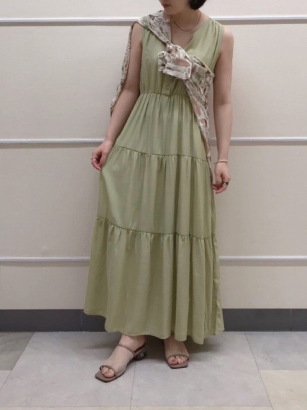 ティアードワンピースとシアーサンダルの涼しい夏コーデです🌱 柄シャツはコーデのアクセントになるのでおすすめです︎︎☺︎