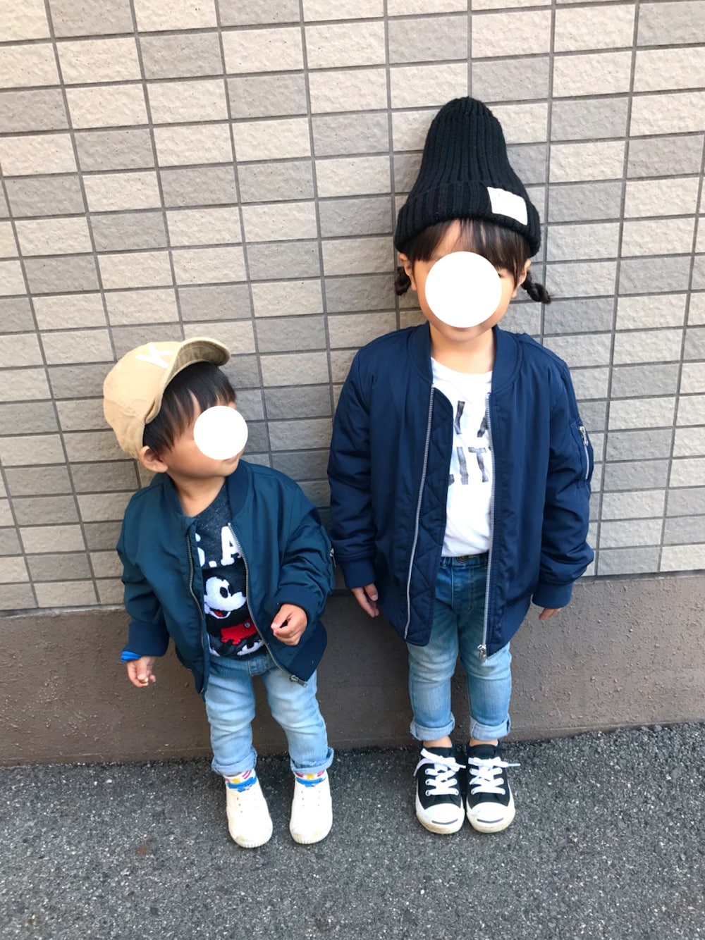 ブランドは違うけど お揃い風のMA-1 ◡̈⃝ 頭の大きな弟くんは お姉ちゃんの帽子を兼用で被ります❁ 姉…3歳 100〜110cm着用 弟…1歳 90cm着用