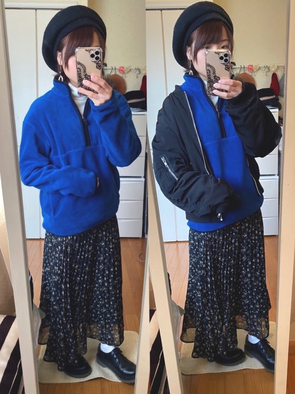 あったかコーデ メンズのブルーのフリーストップス 中に白のフリースタートルヒートテック 重ね着であったかコーデ❁ 今日は寒すぎるから温かさ重視しつつ ブルーが際立つよう他は黒で統一!