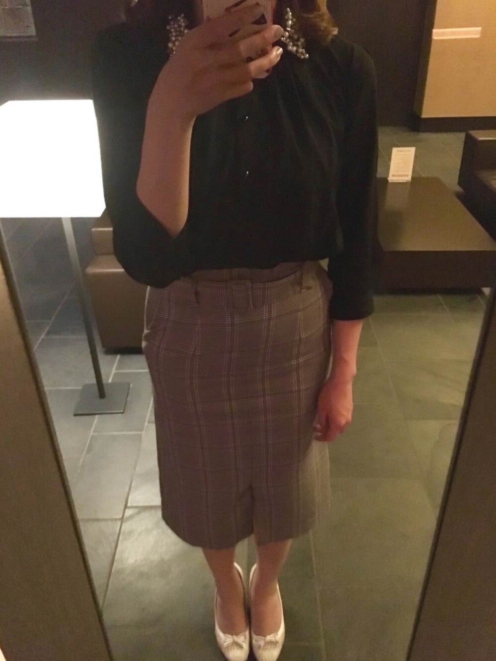 ある日の通勤コーデ♩ 涼しくなって来たので、コーデも秋仕様に🍁 数年前のLAISSE PASSEのビジュー襟ブラウスに、Natural Beauty Basicのチェックのスカートを合わせました☆ LAISSE PASSEのブラウス、もう5年以上毎年活躍してる気がする‥😂笑