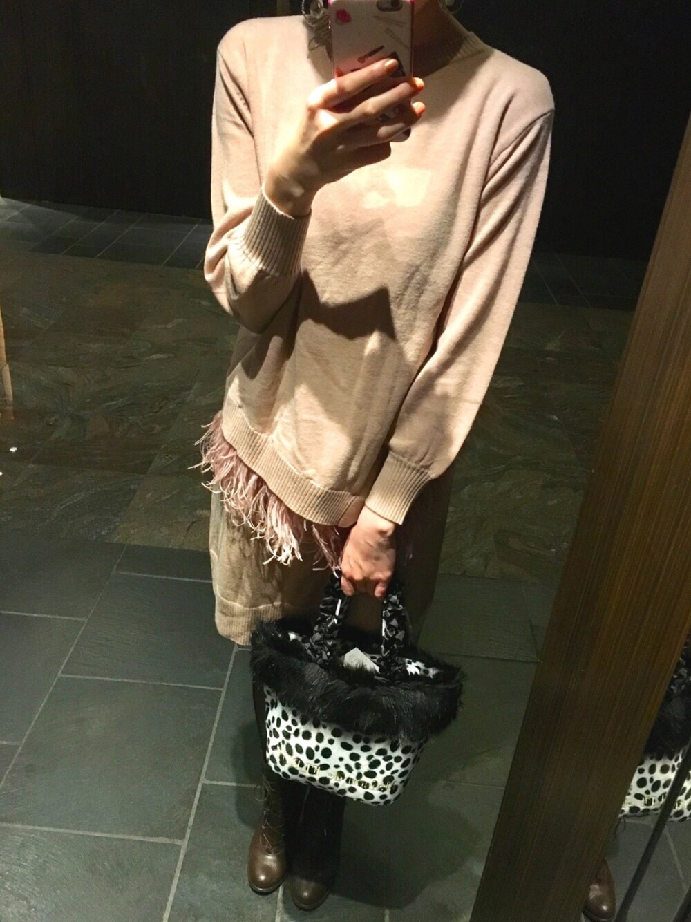 休日のお出掛けコーデ♡ JILLSTUARTのピンクのニットワンピにMaison de FLEURのダルメシアン柄のファーバッグを合わせました🎀 ニットワンピ好き過ぎて、秋冬は大体ニットワンピ😂一枚でさらっと着れて本当に楽ちん✨