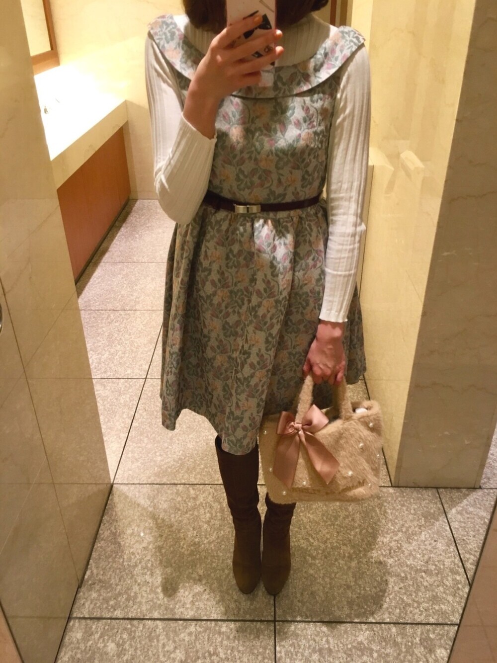 休日のお出掛けコーディネート♡ fifthのタートルネックニットに、JILLSTUART whiteの花柄ワンピースを合わせました🤗♥️ 全然見えないけど、ワンピースは背中のデザインが凝っていて可愛い🥺💕