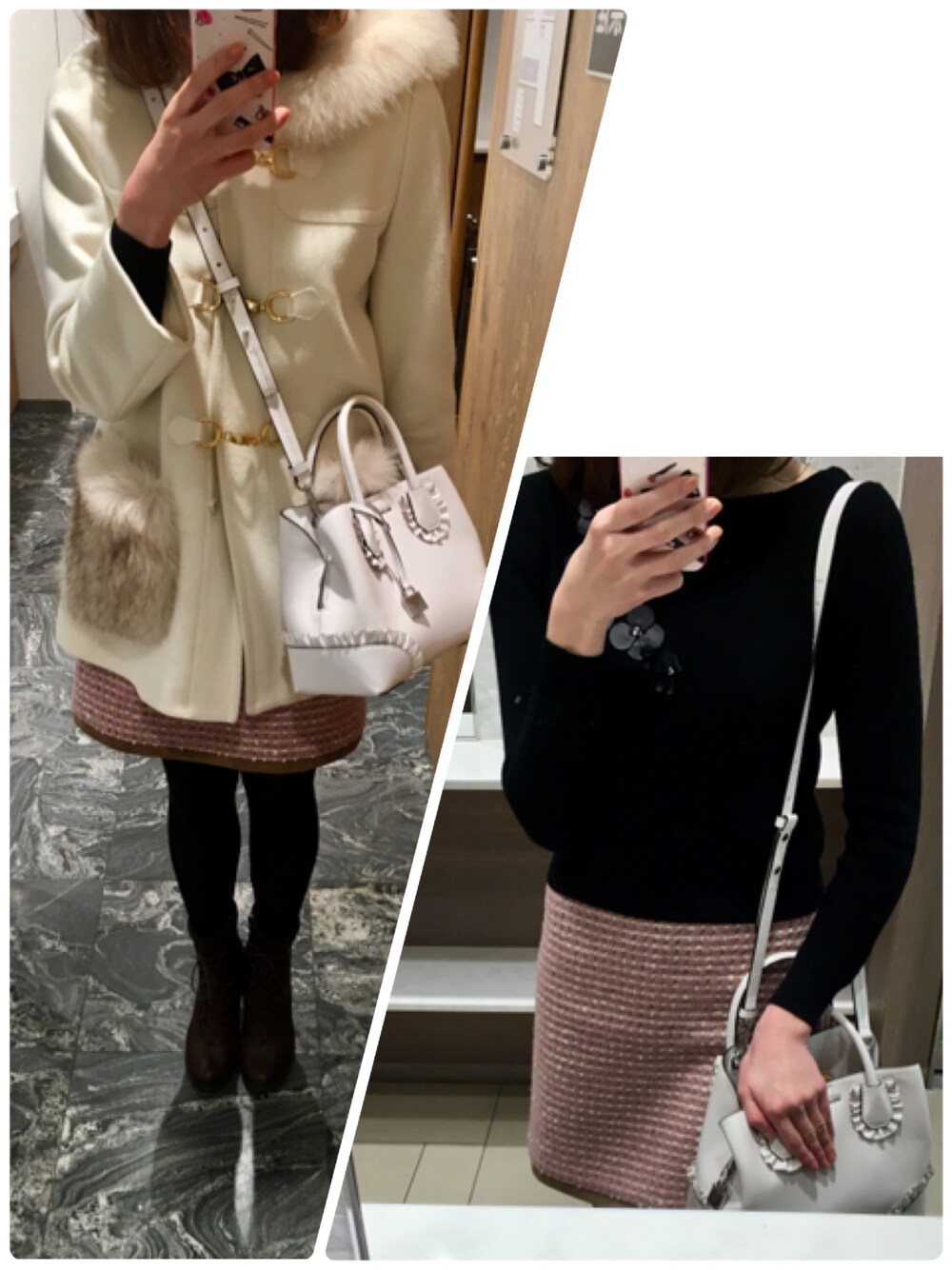 休日のお出掛けコーディネート💜 Aveniretoileのお花モチーフニットに、JILLSTUARTの台形スカートを合わせました👯♀️💕 アウターは、ずーっと使っているRirandtureのダッフルコート🥰