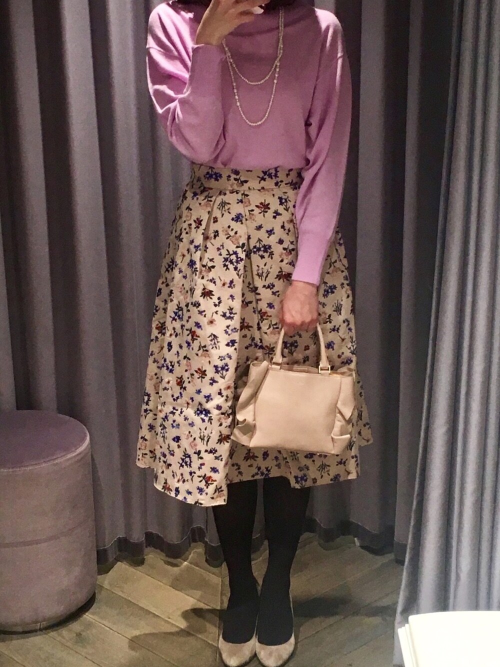 休日のお出掛けコーディネート🧡 JILLSTUARTのパープルのカシミヤニットに、フラワースカートを合わせました🥺💕 モデルさんがこの通り着ていて、凄く可愛いと思って真似してみました😂