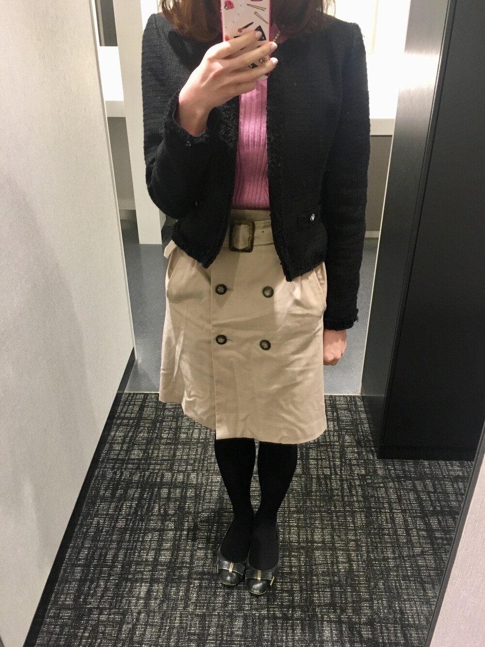 ある日の通勤コーディネート☆ JILLSTUARTの袖パールニットに、Andcoutureのトレンチスカートを合わせました😊❤️ アウターは、Aveniretoileの黒ツイードのノーカラージャケット💄