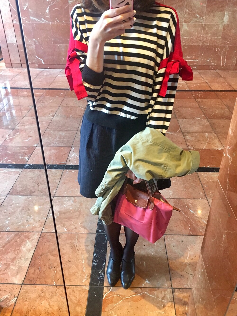休日のお出掛けコーディネート🧡 LANVIN en Bleuのボーダーニットに、JILLSTUARTのネイビーのスカートを合わせました😊❤️ マリンテイストなコーディネート🏖