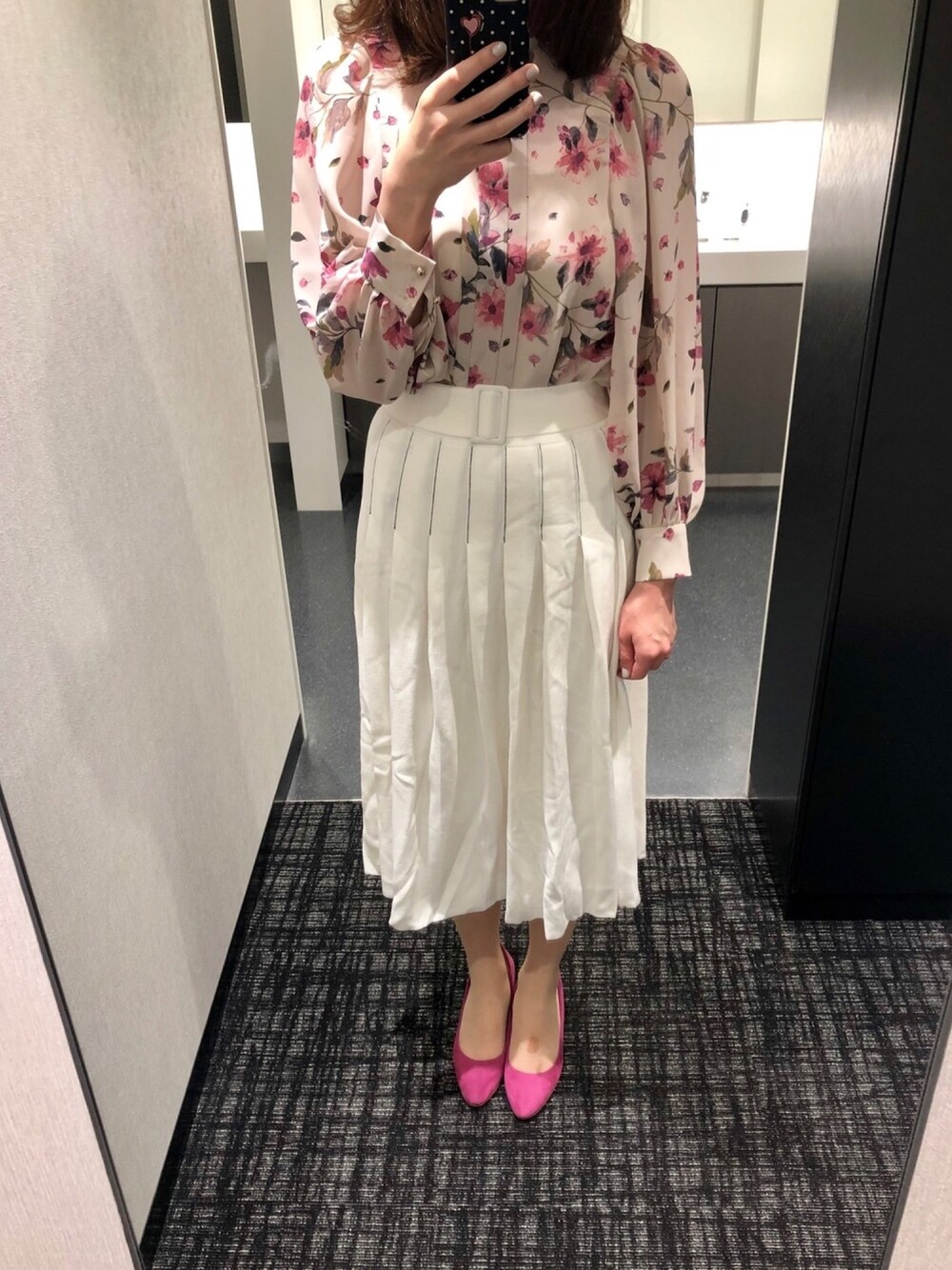 ある日の通勤コーディネート❁ JILLSTUARTの花柄ブラウスに、CELFORDのニットスカートを合わせました🌷💕 今日はピンク系でまとめてみました♥️