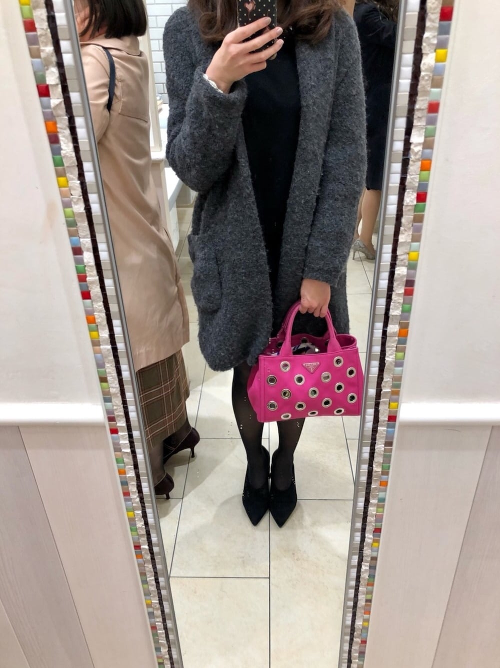 休日のお出掛けコーディネート💖 Aveniretoileの七分袖ワンピースに、M-PREMIERのニットコーディガンを羽織りました🧸💕 コーディガンもこもこしてて暖かい〜😚💓
