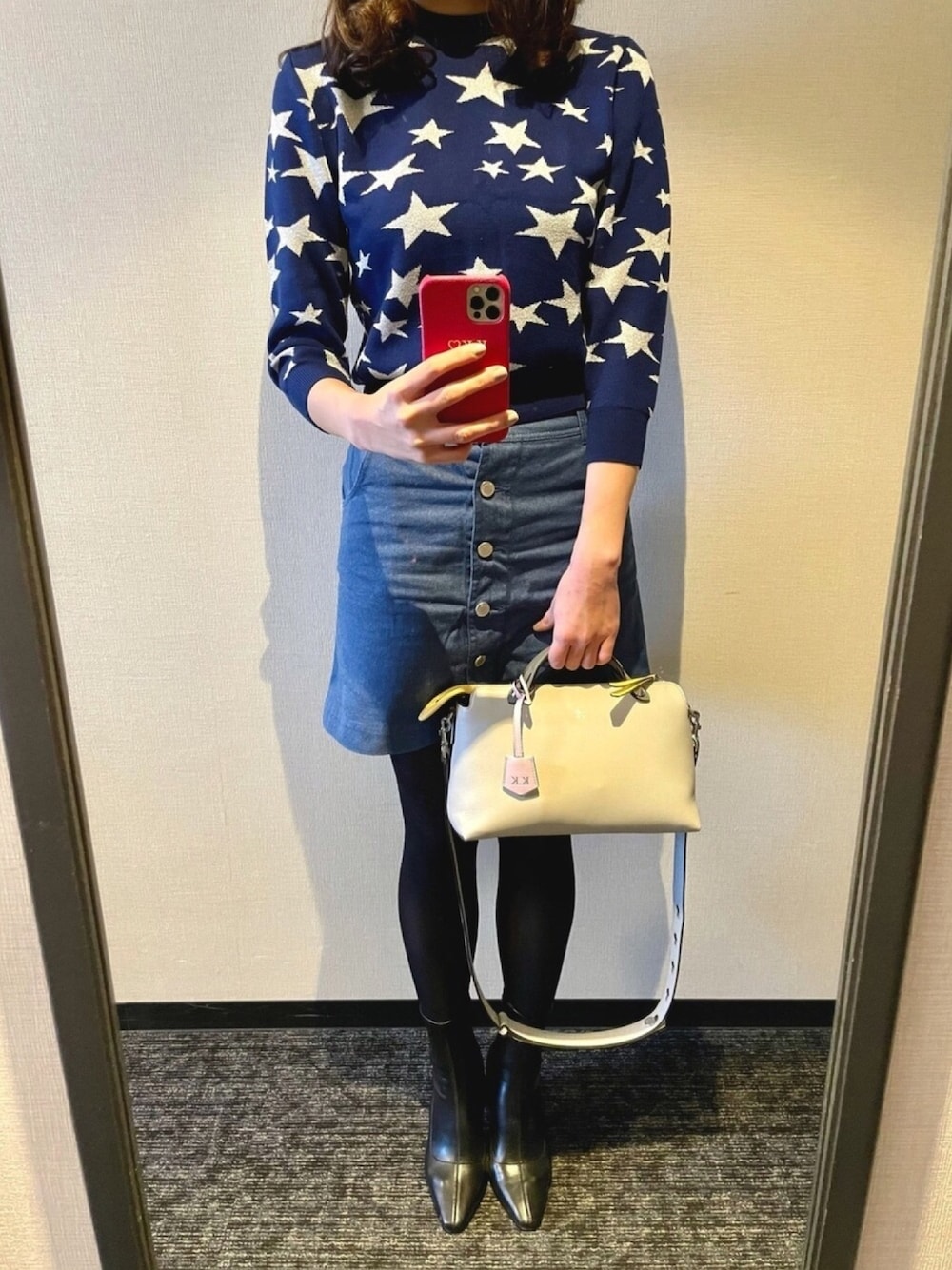 休日のお出掛けコーディネート💝 LOEWEの星柄ニットに、JILL by JILLSTUARTのデニムスカートを合わせました👼🏻💓 LOEWEのニット凄いお気に入りなんだけど、今日着るには薄着過ぎた🥲