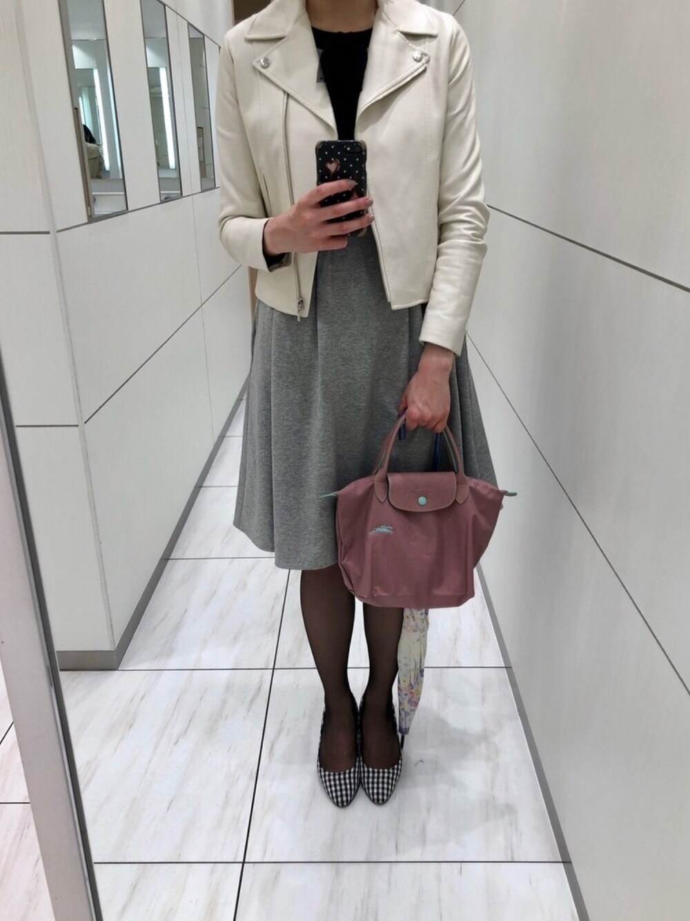 休日のお出掛けコーディネート🤎 Aveniretoileのボウタイワンピースに、レザージャケットを合わせました🐣💛 ワンピースは一枚で着た方が可愛かったな‥😇