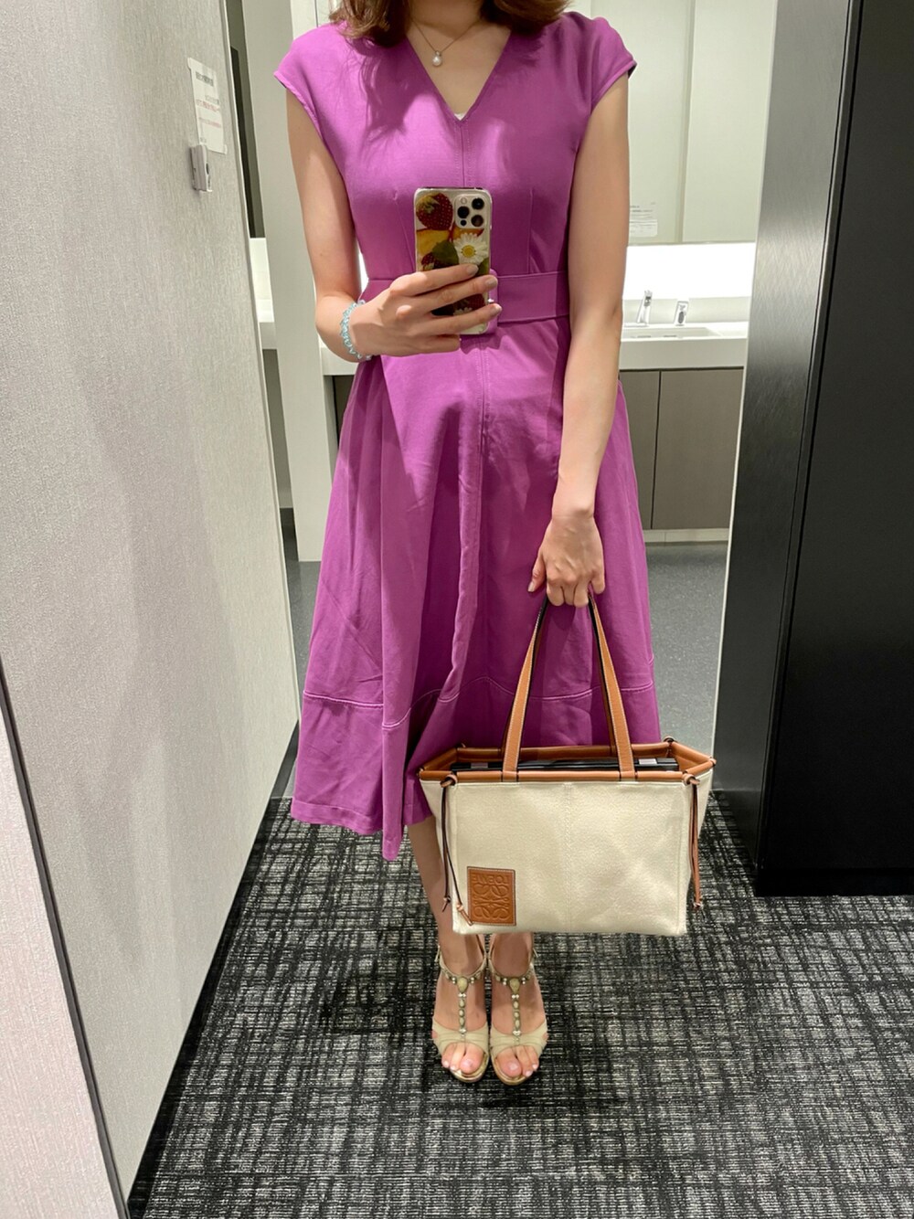 ある日の通勤コーディネート♡ JILLSTUARTのパープルのワンピースに、LOEWEのクッショントートを合わせました🧸💕 このワンピース着るには少し肌寒かった‥😇