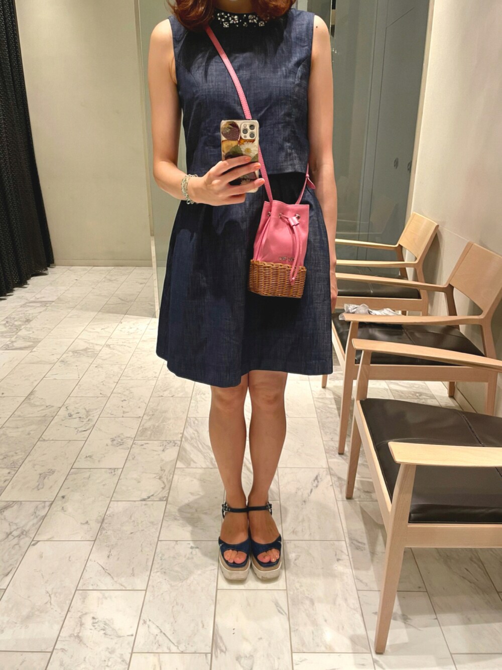 休日のお出掛けコーディネート❣️ Aveniretoileのデニムワンピースに、STELLA McCARTNEYのデニムサンダルを合わせました😊❤️ miu miuのかごバッグ丁度良いサイズでお気に入り🥺💕