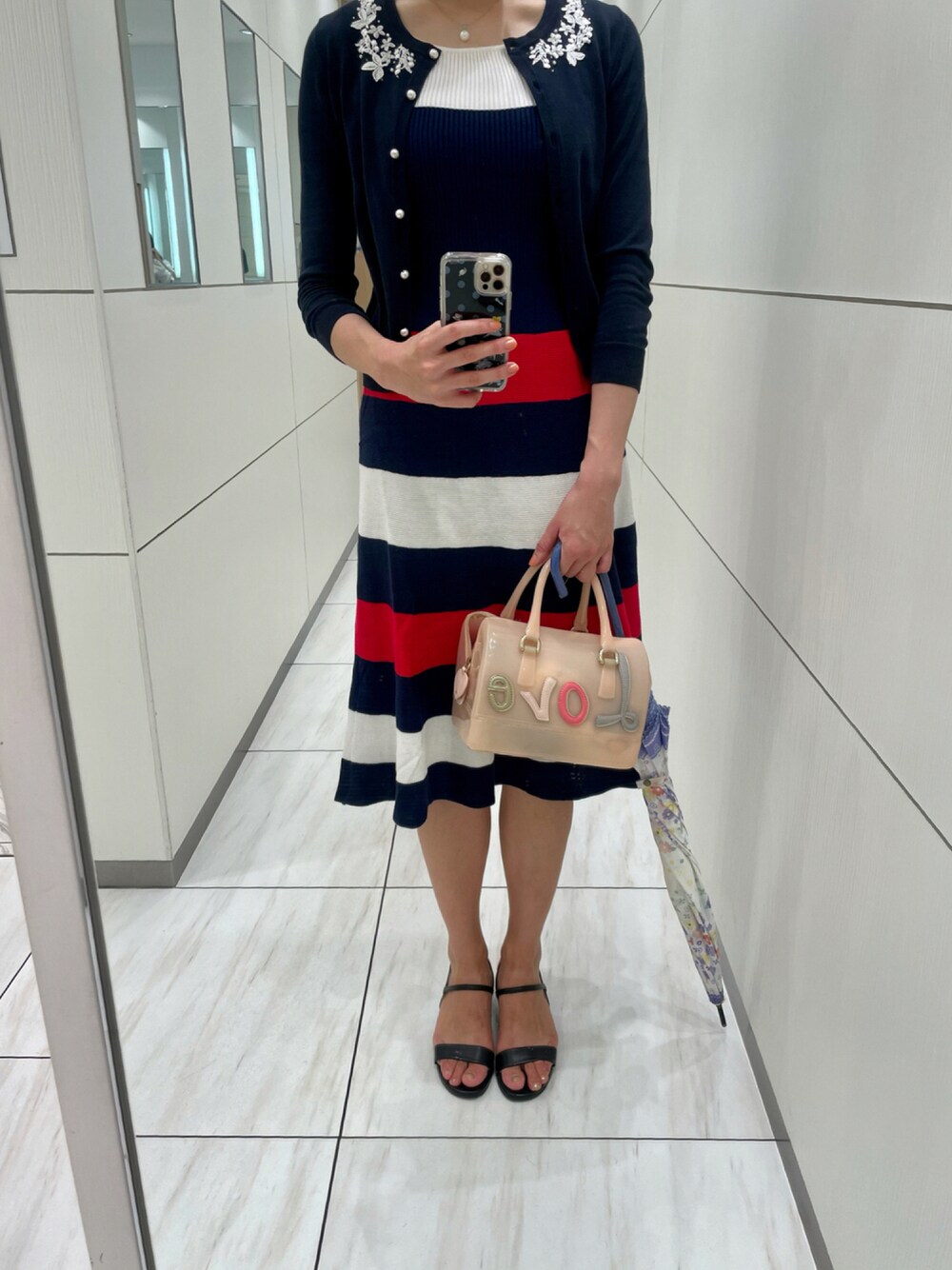 休日のお出掛けコーディネート💘 AndCoutureのニットワンピースに、Aveniretoileのカーディガンを合わせました😊❤️ ネイビーと赤の組合せにしてみました🥺✨