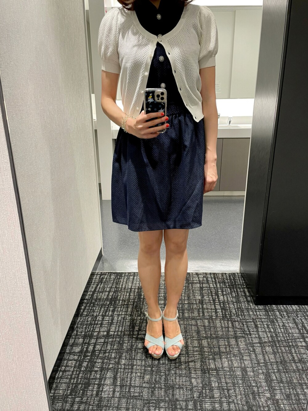 ある日の通勤コーディネート☆ Aveniretoileの襟付きワンピースに、JILLSTUARTのメッシュカーディガンを羽織りました😊❤️ 全然見えないけど、ワンピースはラメ素材になっていて可愛い🥺💕