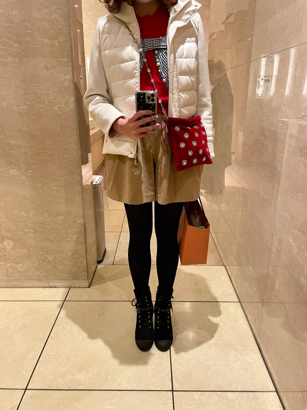 休日のお出掛けコーディネート💙 Chestyのリボンニットに、Aveniretoileのショートパンツを合わせました👯♀️💕 赤とベージュ系でまとめてみました❤️💛